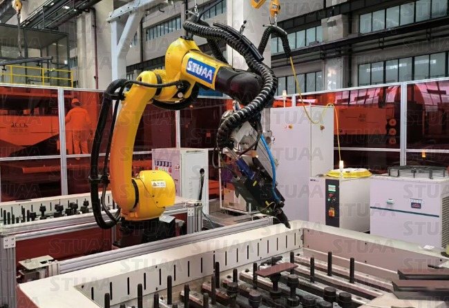超大功率(12,000瓦)完全实现机器人免示教激光切割坡口设备。工件图纸导入到电脑中,工件随意的放在工作台上,机器人通过视觉拍照,给工件定位,无需人工编程,可自动生成程序,一键启动,进行切割。本台设备配备了双工位,可以满足客户多品种小批量的问题,可以适应多种型号工件的打坡口工艺!